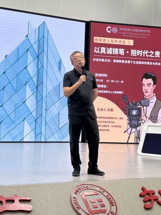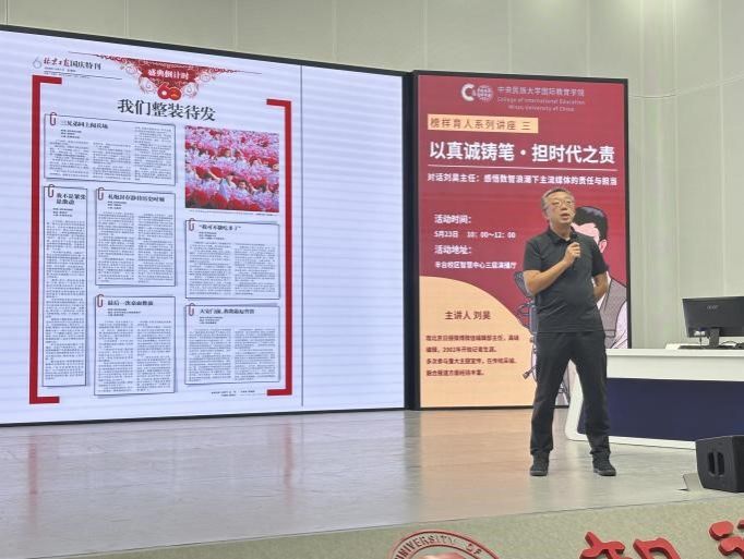的“不解之缘”为开场,结合自己二十余年的记者从业经历,回顾了传统媒体向新媒体转型的变革,分享了大量新闻报道和新媒体内容创作的实例,深入阐释了“真诚”在信息传播中的核心价值。他将“真诚”拆解为“真实真相真情、诚意诚实诚恳”,点明了新闻人织补碎片化信息的秘诀;他用“有趣、有用、有温度、有价值”四个看似简单实则不平凡的词语归纳了媒体从业者在新时代的努力坚守与责任担当。刘主任鼓励大家珍惜大学时光,坚持深度思考,做好充分准备,以适应未来变化,向世界展示更可爱的中国形象。