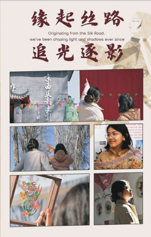 本科生杨灿语、周泓池和研究生郑新宇团队的作品《缘起丝路,追光逐影》荣获大赛一等奖。同时,江傲霜老师获评“优秀指导老师”荣誉称号。