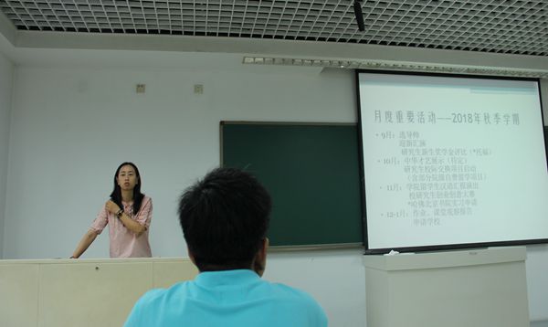 孙老师为各位新生同学详细讲解了研究生学习生涯的各项安排与活动,大家都为丰富的研究生学习生涯而期待不已。紧接着刀慧娟老师讲解了学生的各类要求,并组织了第一次班会,大家也非常开心的进行自我介绍,整场典礼在学生们的欢声笑语中圆满结束。