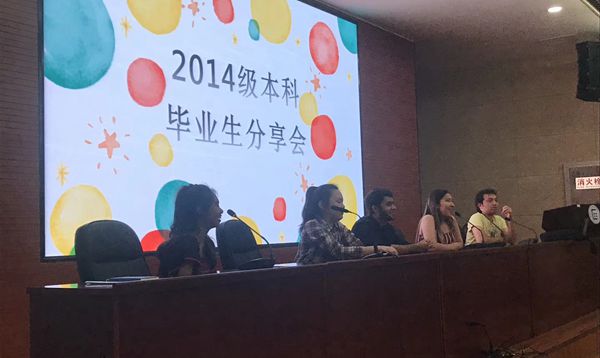 来自美国的和平鸽同学在经验交流分享会中建议大家多加入一些中国学生的社团,这样可以扩展自己的朋友圈,她说我们来中国学习应该多交一些中国朋友。她说读高中的时候不喜欢跟老师沟通,老师一提问她就会出汗,但是到了中国以后她发现老师和同学们都很好,也渐渐的会跟老师们沟通了。