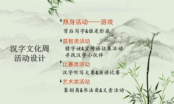 “活动策划类”汇报展示包括“海外学校的文化活动调查与汇报”、“汉字文化周的组织与策划”。在汉字文化周组织与策划活动中,汉教硕士们设计了汉字书法比赛、汉字听写大赛、汉字游园会、字谜比赛等多种活动。两组同学的汇报条理清晰,内容充实,并富有创意。