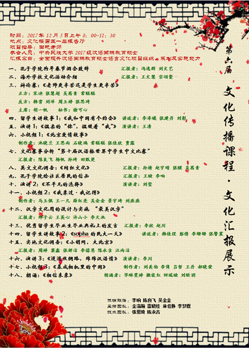 此次汇报展示是汉语国际教育硕士核心专业课程《中华文化传播课程》的一个有机组成部分,该课程由田艳副教授主讲。课程共分为三个部分:1、课堂教学部分。该部分共10个课时,由田老师在课堂上利用鲜活真实的案例进行相关知识的传授,同学们参与讨论互动。2、汇报展示。该部分共4个课时。内容由田老师进行总体设计和策划,设置6大类任务,全体同学分组进行准备和实施。根据任务的特点和难点,每组2-6人不等。田老师对各组任务进行具体指导,提供相关帮助。3、实战操练。邀请并指导部分汉教硕士,对国际学生语言文化项目进行实战指导。