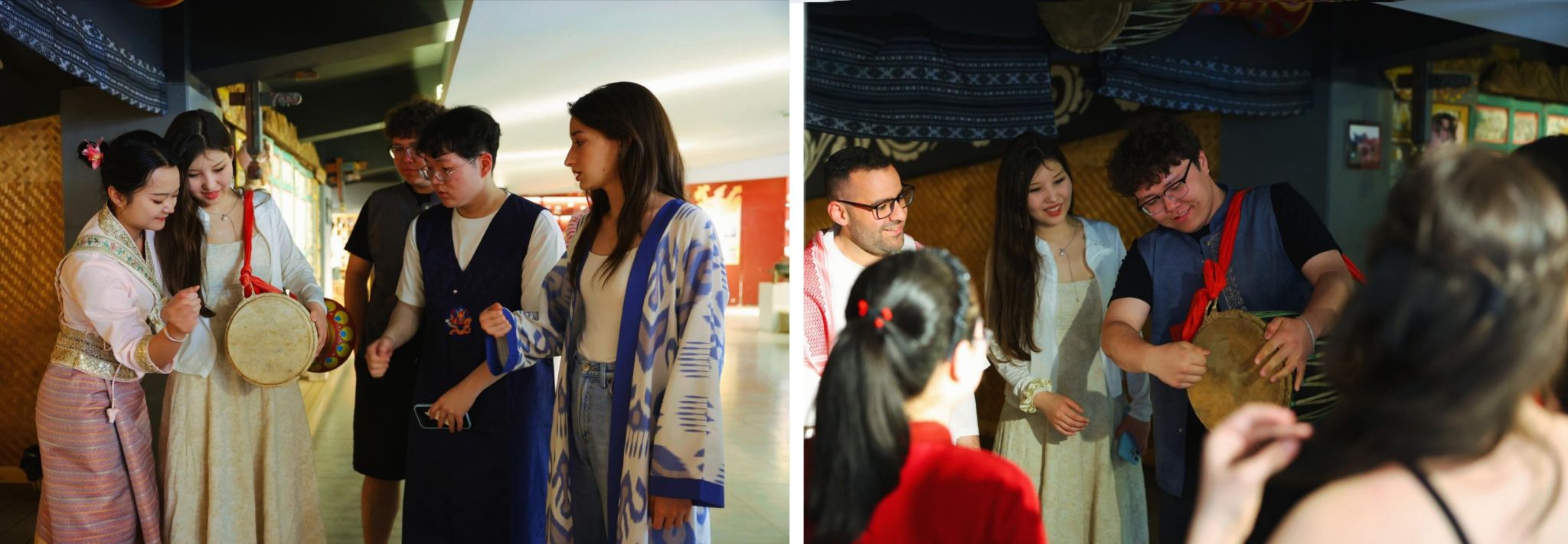 活动期间,留学生们开启了丰富多彩的文化体验之旅。一是茶文化研学。走进白茶馆,了解大白茶的种植、制作工艺与品饮文化,观看学习采茶、制茶工艺,品尝和感受中国茶文化的深厚底蕴与独特韵味;二是民俗文化体验。在勐卧双塔广场参与采花取水堆沙、万人点灯祈福等傣族传统活动,在文体中心广场参与万人赶摆,融入傣历新年热闹氛围,近距离感受傣族泼水节的文化内涵与民族风情,在民俗体验院落感受彝族说唱文化的魅力;三是体验传统美食文化。从取叶、洗叶、籼糯米制备到包裹上锅,亲手制作傣族美食粑粑;四是非遗文化交流。参观非遗会客厅,与当地非遗传承人面对面交流,了解傣族织锦、彝族刺绣、云南金陀螺等传统技艺,感受非遗文化的生命力与创造力。