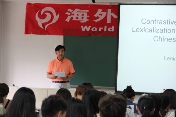 本场讲座围绕英语中的词汇化展开,分为词汇化和词语搭配两个部分。首先,刘乐宁教授介绍了词汇化的定义,然后分别对比了中英文句法中使动用法、主从关系、动宾结构的区别,并通过大量例子来说明观点。然后,刘乐宁教授通过提出问题:中文里的很和英语里的very一样吗?引发同学们的讨论,然后巧妙地引入讲座的第二部分——词语搭配。刘教授指出了汉语词汇数量只有英语的五分之一,所以汉语词汇的搭配能力比英语的强;并提出目的语中有标记的而在母语中未被标记的词语容易被错误使用。