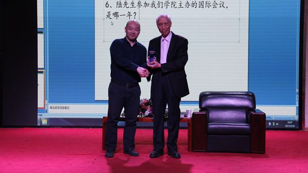 李锷副书记为陆俭明教授颁发大师面对面定制纪念杯
