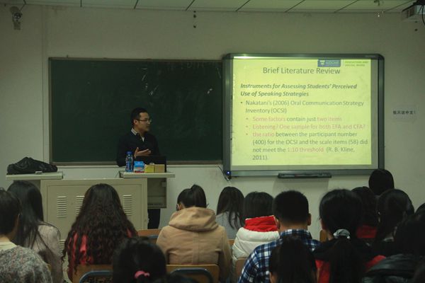 汉语国际教育专业首届硕士毕业生、现公派至新西兰奥克兰大学教育学与社会工作专业攻读博士的孙培健回到学院,为2015级汉语国际教育硕士生做了题为《Development and Validation of a Speaking Strategy Inventory for Learners of Chinese (SSILC) as a Second Language》的学术报告,报告全程用英文进行。
