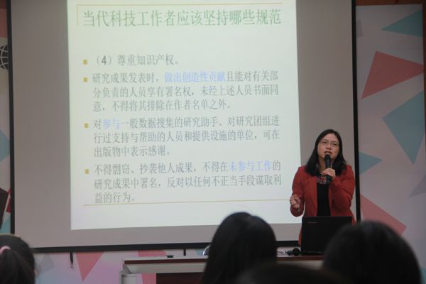 继而,曾立英教授向大家介绍了“什么是科研规范”、“科技工作者应该坚持的规范”、以及“研究计划规定中的规范”、“引文规范”、“署名规范”、“投稿规范”等,在师生中进一步弘扬严谨治学的科学精神,养成恪守学术诚信的自觉。
