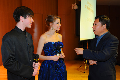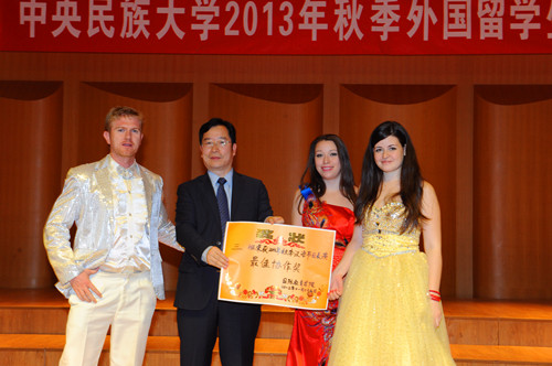 在一年中取得的骄人成绩和学院的新发展:研究生大合唱勇折桂冠,荣获全校第一名;学院教师在知名刊物上发表20多篇学术论文和10本研究生教材。最后,由马文喜副校长和吴应辉院长分别为获奖节目颁奖,2013秋季外国留学生汉语汇报演出就此圆满落幕。