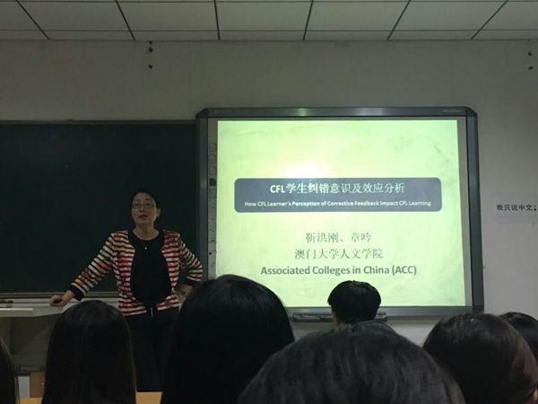 靳教授是语言学专家,研究领域包括第二语言习得、语言认知、课程设计、师资培训等,她曾获得卡内基全美优秀教授奖、汉明顿校际最佳教授奖、国家关键语种学会沃顿 (Walton)终身贡献奖,以表彰她的杰出成就。此次讲座主题为“CFL学生纠错意识及效应分析”,此次讲座包括发展背景、纠错反馈的条件、纠错技巧和纠错实证研究等几个部分。讲座对纠错反馈条件和纠错辨识度的特点进行了细致的解析。