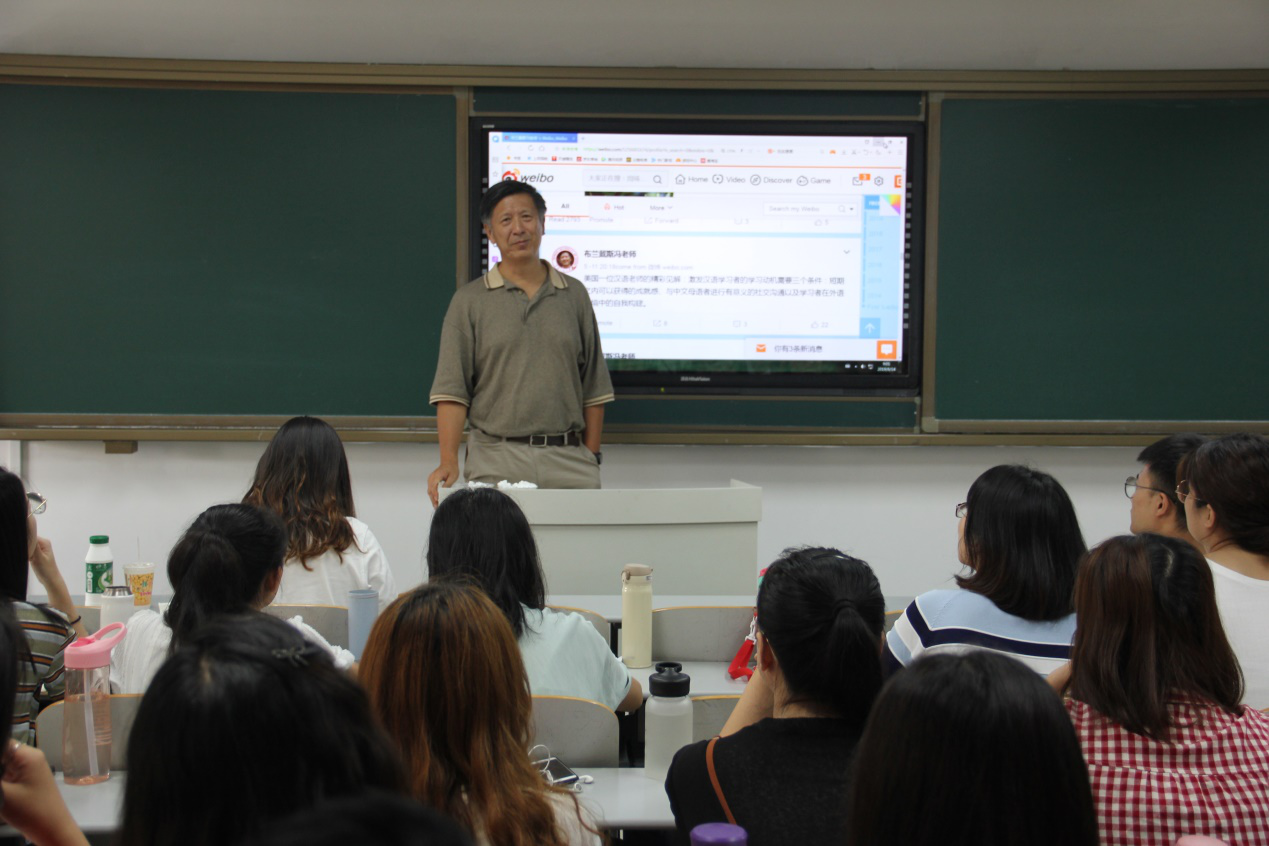 8月20日,冯禹教授做了题为“商务汉语:发展与挑战”的讲座。讲座讲了从哈佛大学的高级商务汉语到布兰戴斯大学的高级商务汉语的发展过程,提出了商务汉语对对外汉语教师的挑战,并介绍了任务型教学法。冯禹教授的课堂激情澎湃、妙语连珠,不时赢得同学们的热烈掌声。讲座现场气氛热烈,欢声笑语一片,同学们与老师的互动也异常活跃。