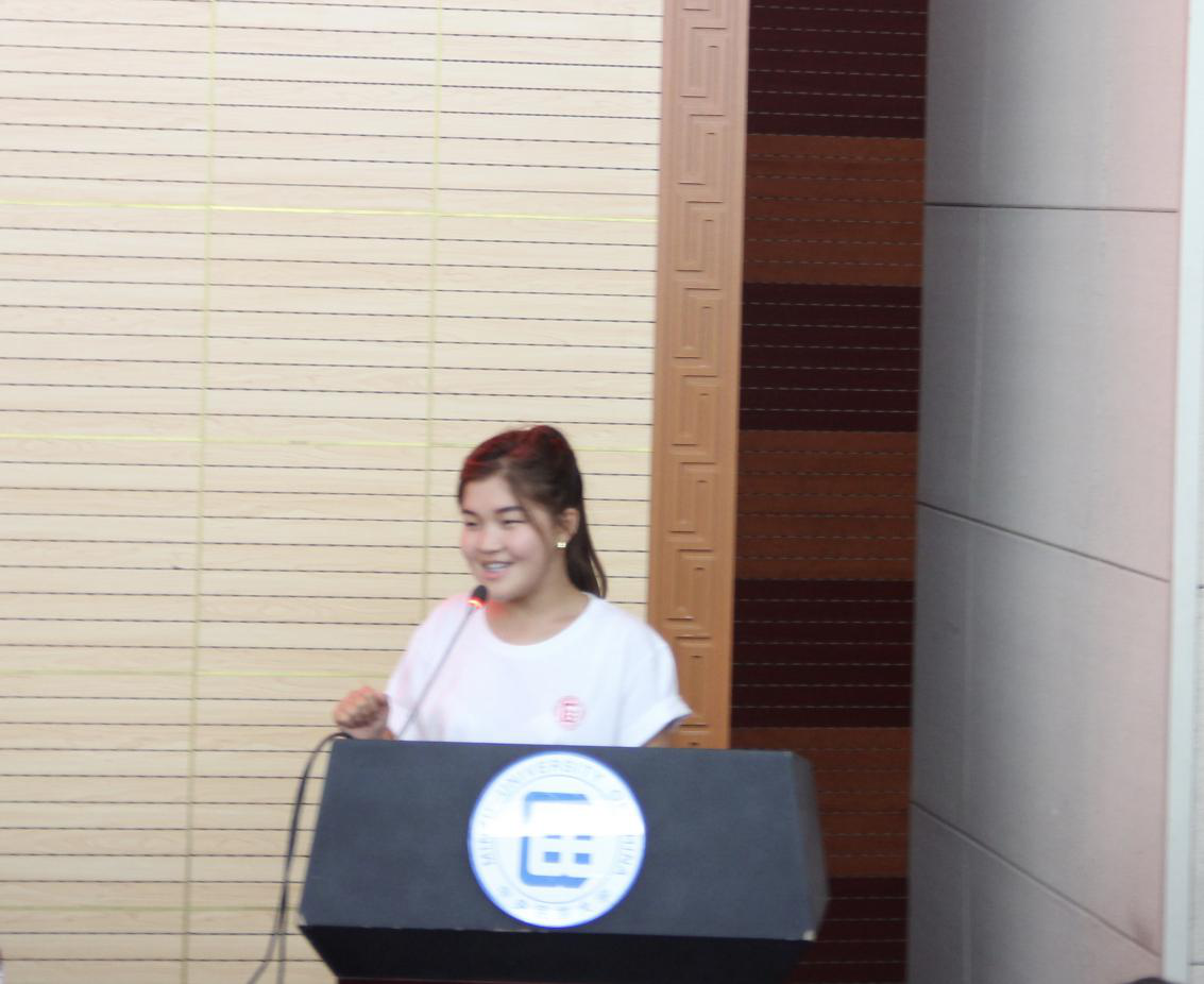 外国本科生新生代表,来自吉尔吉斯斯坦的美丽分享了她学汉语的经历以及对中国的印象。她很感谢中国政府给她提供的宝贵的学习机会,并表示大学四年要努力学习汉语,多参加各种各样的活动。