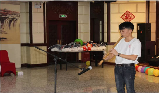 在全场捧腹欢笑的你画我猜游戏之后,由韦功德同学为我们带来笛子独奏《青花瓷》。笛声悠扬而起,清脆与柔和相应,宛若淙淙细流,婉转清脆。