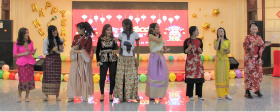 本场联欢会的第三个游戏是“少说话多做事”,参加游戏的7名同学分别需要有一个字、两个字、三个字、四个字、五个字、六个字、七个字来回答主持人的问题,可以说这轮游戏是大脑反映速度的比拼。游戏结束后,来自九个国家的九名同学,身着九种不同的民族服饰,一起为我们带来了多语种歌曲《Hello,Stranger!》。