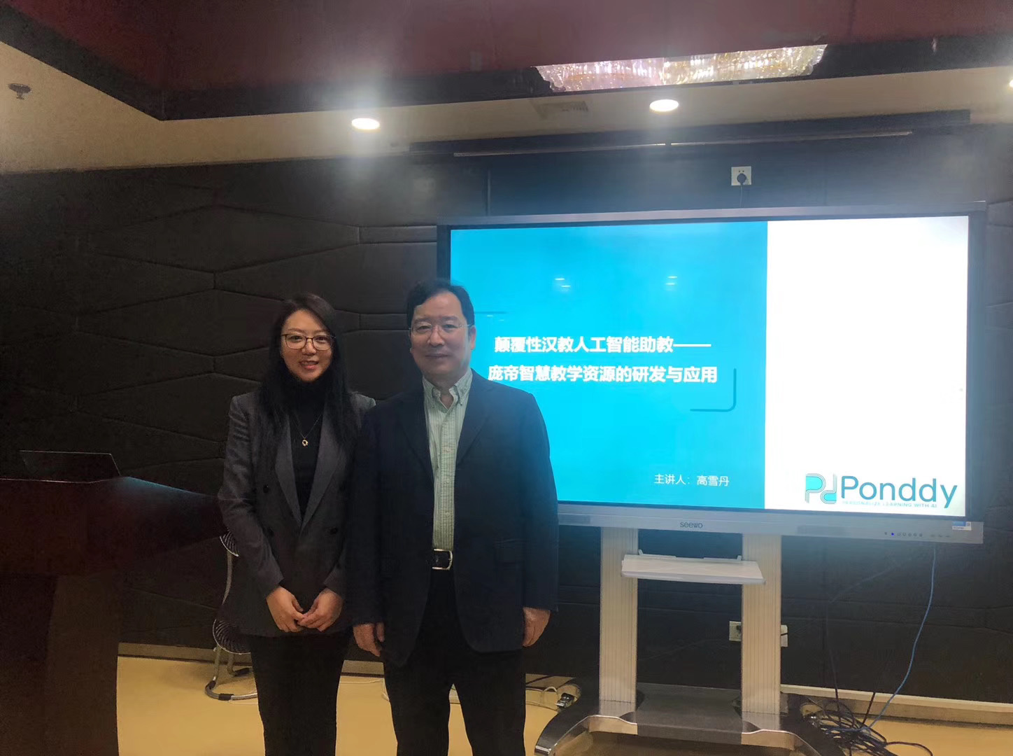 报告厅进行了两场名为“颠覆性汉教人工智能助教——庞帝智慧教学资源的研发与应用”的讲座。