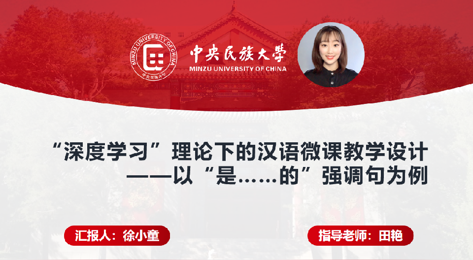 徐小童同学通过行动研究、访谈调查等研究方法,从知识、技能、情感三个目标着手,在深度学习理论的指导下对汉语微课进行教学设计分析。评审专家认为该生在研究成果讲解中注重理论与实践的结合,选题为国际汉语教学领域较为前沿的内容,讲解生动详实,令人耳目一新。