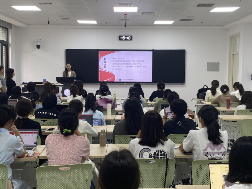 随即,由院学生会就各部门工作职能、招新要求等方面为新生展开宣讲。学生会文体部、学习部、宣传部、生活权益部、心理健康工作部,各个部门委员积极热情地向新生介绍部门日常工作,讲解各具特色,给新生留下了深刻印象,让新生领略到了参与学生工作之后所得到的锻炼与发展。