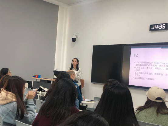 首先,教学秘书孙宓琪老师对三年内六个学期的研究生培养方案及课程安排进行了全面而又系统的讲解。重点强调了出国留学及交流项目、优秀毕业生和奖学金评选申请条件以及毕业论文的相关事宜。除此之外,孙老师也对同学们未来的学习、生活做了引航规划,强调了本科生到研究生心态的转变,并鼓励同学们在合理规划学业后积极参加与专业相关的实践活动。