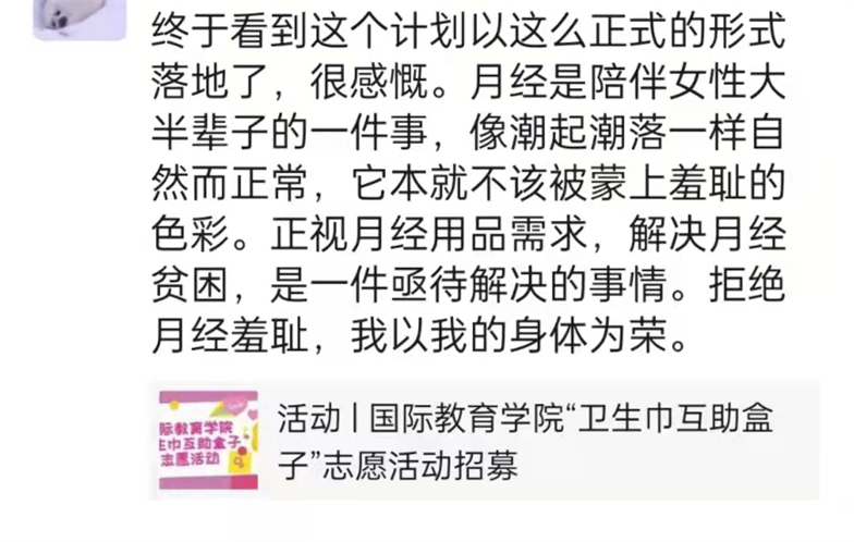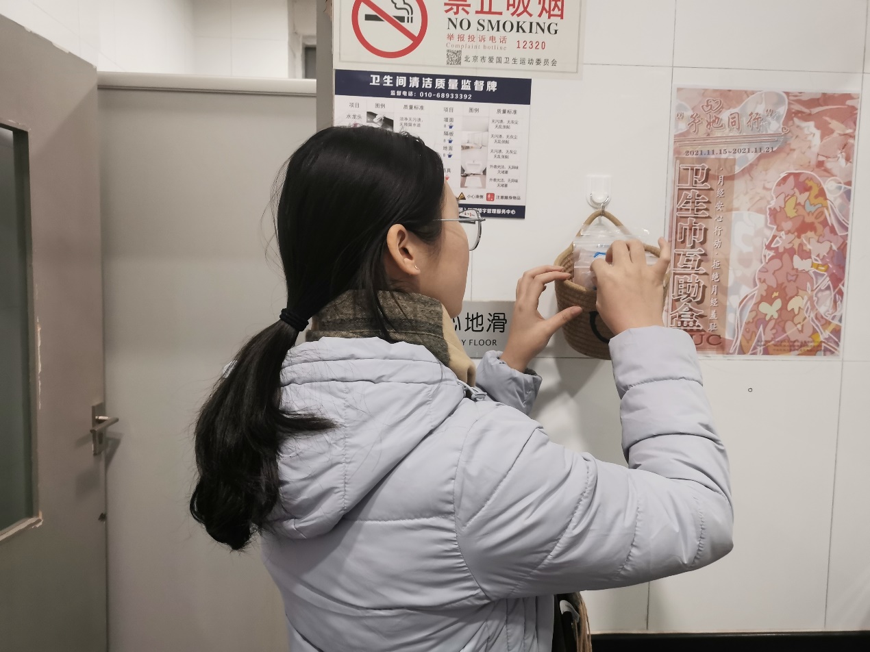 “卫生巾互助盒子”志愿活动圆满结束。本次志愿活动的宗旨是更好地关心和关怀女性,帮助女性悦纳自己,拒绝月经羞耻。活动以在卫生间放置“卫生巾盒子”,免费为有需要的同学提供卫生巾为形式开展。活动一经推出,便引起热烈反响,许多同学通过各种方式表示了对本次志愿活动的支持与鼓励。同学们自发在朋友圈热情宣传,以真情实感撰写文案表达对本次活动感受,这生动体现了本次活动的意义:悦纳自己,月经“休”耻。