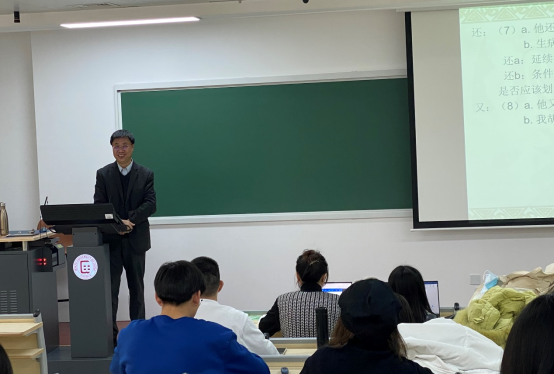 学生进行了一场既有实践意义,又有理论意义的讲座。郭锐教授从“什么样的语义可看作虚词的一个独立义项”的提问切入,以《现代汉语八百词》中某些义项安排的不合理的虚词为例,如“还、也、只、才、又、都”等常用的虚词,将原则与实例相结合来阐释虚词义项划分的原则。进而提出虚词义项划分的原则分别是语义结构的同一性原则、核心义原则、无歧义原则和直接性原则。语义结构的同一性原则指从义项的分的角度看,如果语义结构有差异,可以把虚词划分为不同义项。核心义原则指从义项的合的角度,不同用法共享相同核心义可以合为一个义项。核心义与其他成分结合而产生的整体语义叫做一个词的综合义。无歧义原则是划分同一义项的用法不应产生歧义。直接性原则指出不动用过多的其他因素而是直接解释同一义项的不同用法。