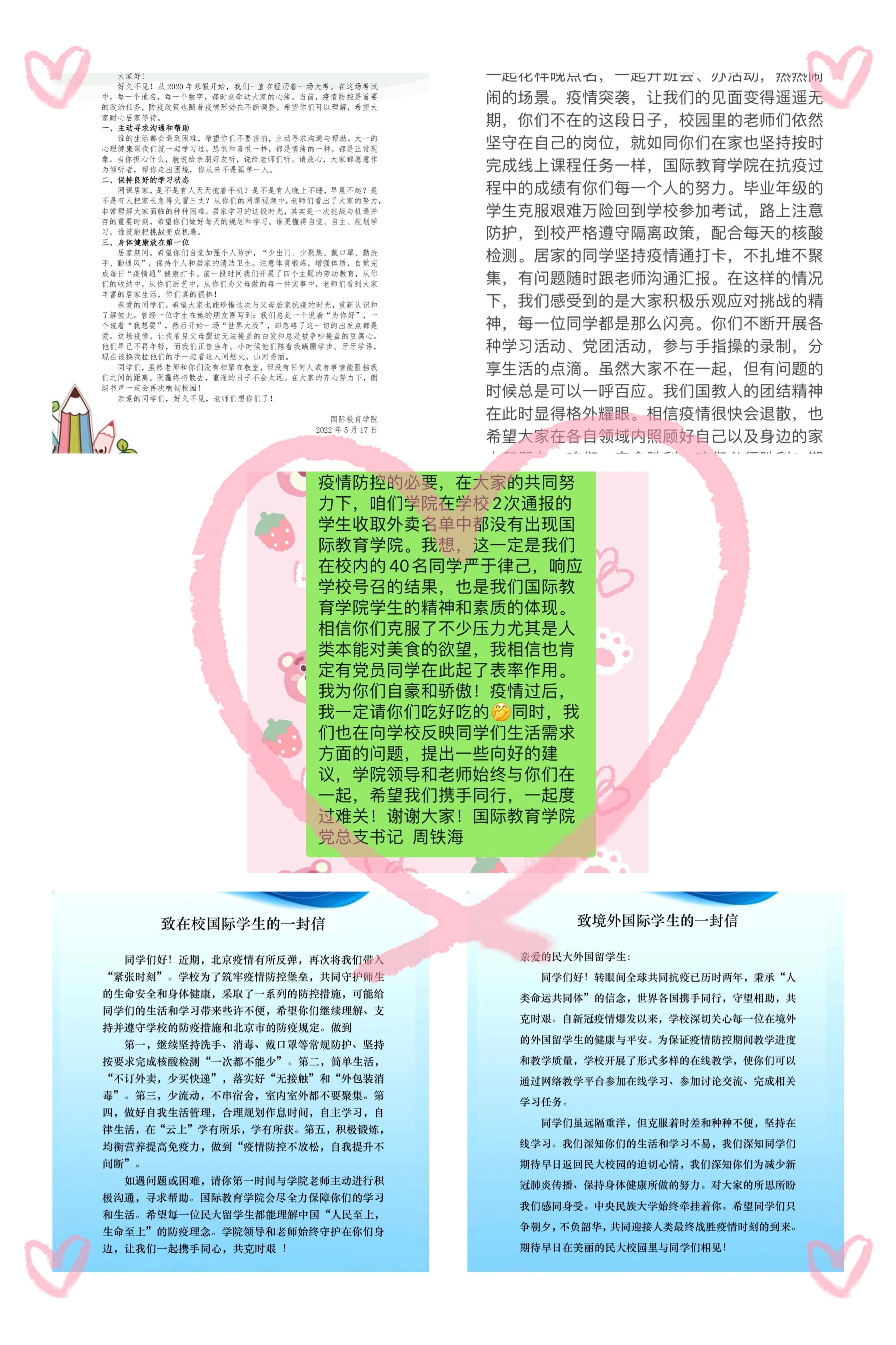 多次召开线上会议,加强对学生的教育引导,准确排查师生每日健康情况、及时统计上报各类动态数据;同时,高度关注中外学生心理健康情况,收集学生合理诉求,发现问题及时处理,保障了疫情下中外学生学习生活的顺利进行。