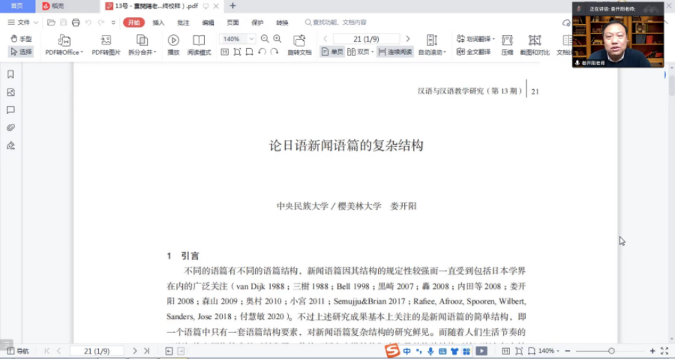 首先,娄开阳副教授以新作“论日语新闻语篇中的复杂结构”为主题,层次递进,详细论证解析了日本新闻语料中的语言结构类型,并结合对比中文篇章结构的特点,对两种语言的篇章结构进行了综合比较分析。该研究成果充分融合了语言学、新闻学、传播学、经济学多学科专业知识,充分体现了该研究成果的跨学科应用研究价值。此外娄老师还就本专业课题申报成功经验进行了深入分享。