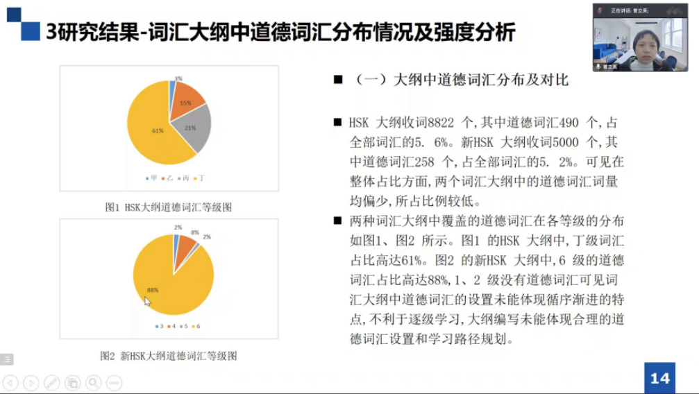 随后,曾立英教授就其最新发表的《国际中文词汇大纲和教材中的道德词汇研究》一文,深入展开论述,对汉语教材(北大版《汉语教程》)中道德词汇的分布及对比、出现强度及与词汇大纲的匹配考量依次做了详细说明。 曾老师的研究是基于数据库进行的统计分析和评估,为银魂漫画
