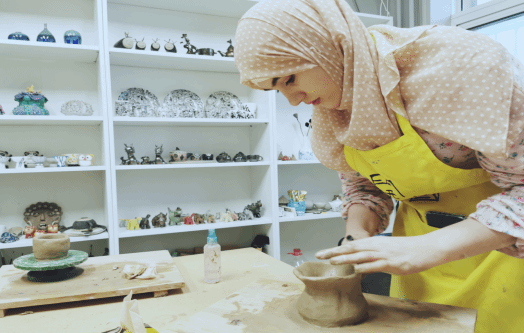 陶瓷是中华民族对世界文明的重要贡献,中国因此也拥有“瓷国”的美称。开心国艺术工作室一件件精致的陶瓷文物,仿佛穿越古老时光,携带着一代代手艺人的匠心来到我们眼前。精美绝伦的釉下五彩,精湛的技艺、优良的品质、独特的工艺,悠久的文化,让留学生们赞叹不已,纷纷拿起手机合影留念。本次的沉浸式教学的高潮出现在DIY陶吧区。陶艺师向留学生介绍示范了手拉坯、彩绘的基础知识和操作手法后,每一位留学生获得了“一显身手”的好机会。留学生们在陶瓷专业教师的指导下,饶有兴致地学习拉坯、泥条盘筑、泥板成型等基本陶瓷成型技艺。他们充分发挥自己的想象力和创作力,运用搓、揉、拍、捏等手法,即兴创作出了寓意丰富、形式多样的陶艺作品,以此诠释他们对艺术作品的美学追求和对中华优秀传统文化的由衷热爱。