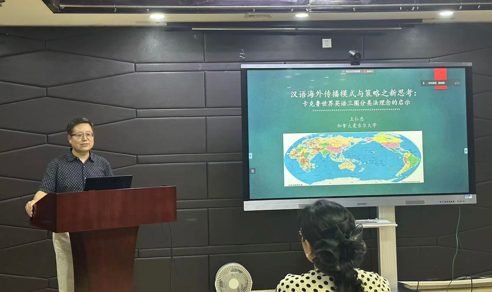 王仁忠教授以《汉语海外传播模式与策略之新思路——卡克鲁世界英语三圈分类法理念的启示》为主题,从“话题的语境:汉语走向世界的雄心与努力”、“卡克鲁(Braj.B.Kachru)世界英语观念提出的背景”、“卡克鲁(Kachru)世界英语三圈分类理论”、 “卡克鲁(Kachru)世界英语三圈分类理念的深远意义”、“卡克鲁(Kachru)三圈分类理念的启示”、“对汉语国际化的启迪”、“汉语国际化、走向世界的途径和策略”、“汉语国际化的愿景与前景:任重道远”等几个方面与大家做了分享。