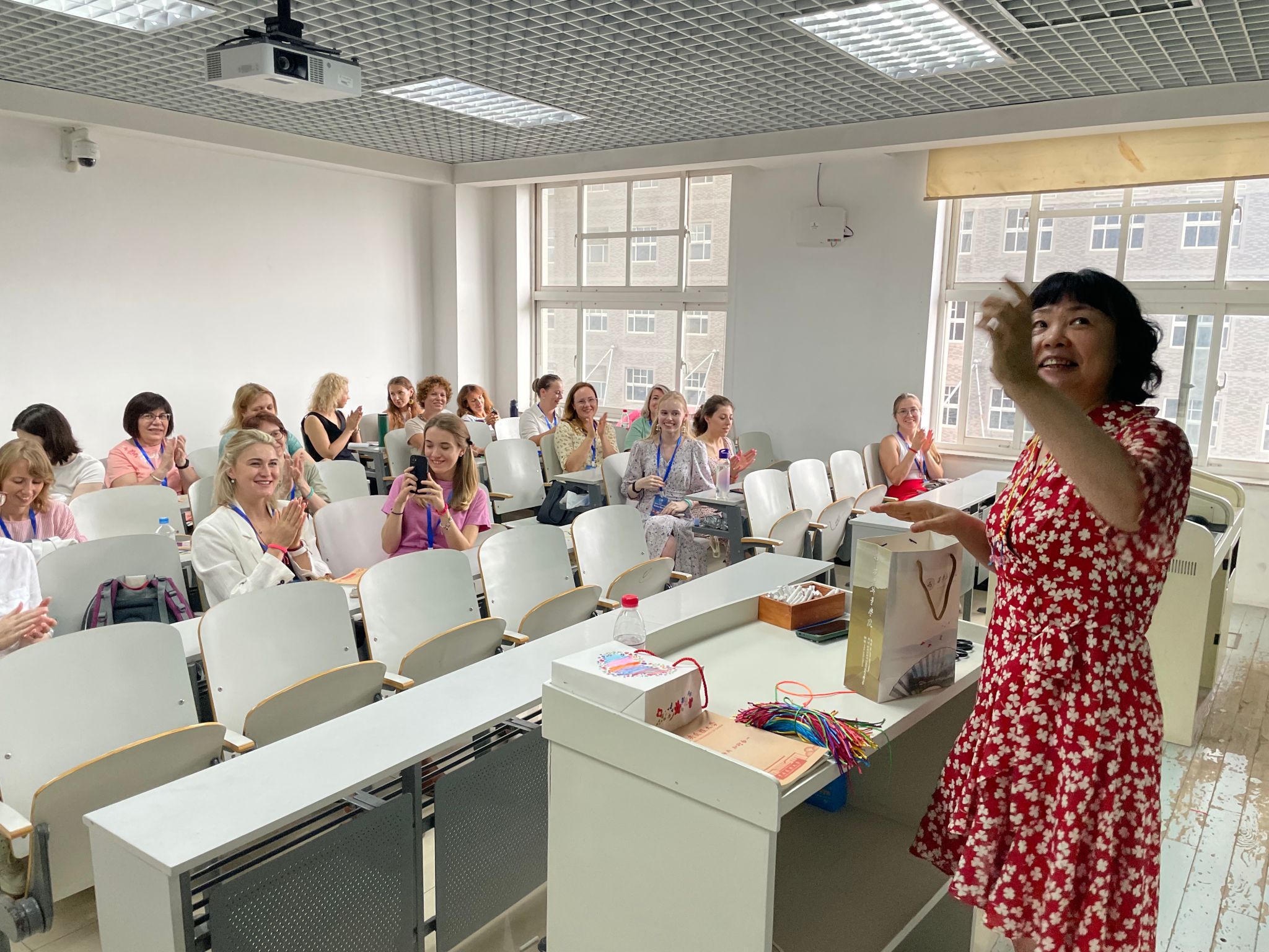 的留学生教育,并表示本次交流项目对促进中俄文化交流、中西文化互鉴都具有重要意义,希望各位俄罗斯的老师能在本次学习中有所收获。王维老师简要介绍了教学安排情况,她表示学院选派了具有丰富教学经验的资深教师承担本项目,同时安排了书法、绘画、剪纸、中国结等丰富的中国文化体验课程。