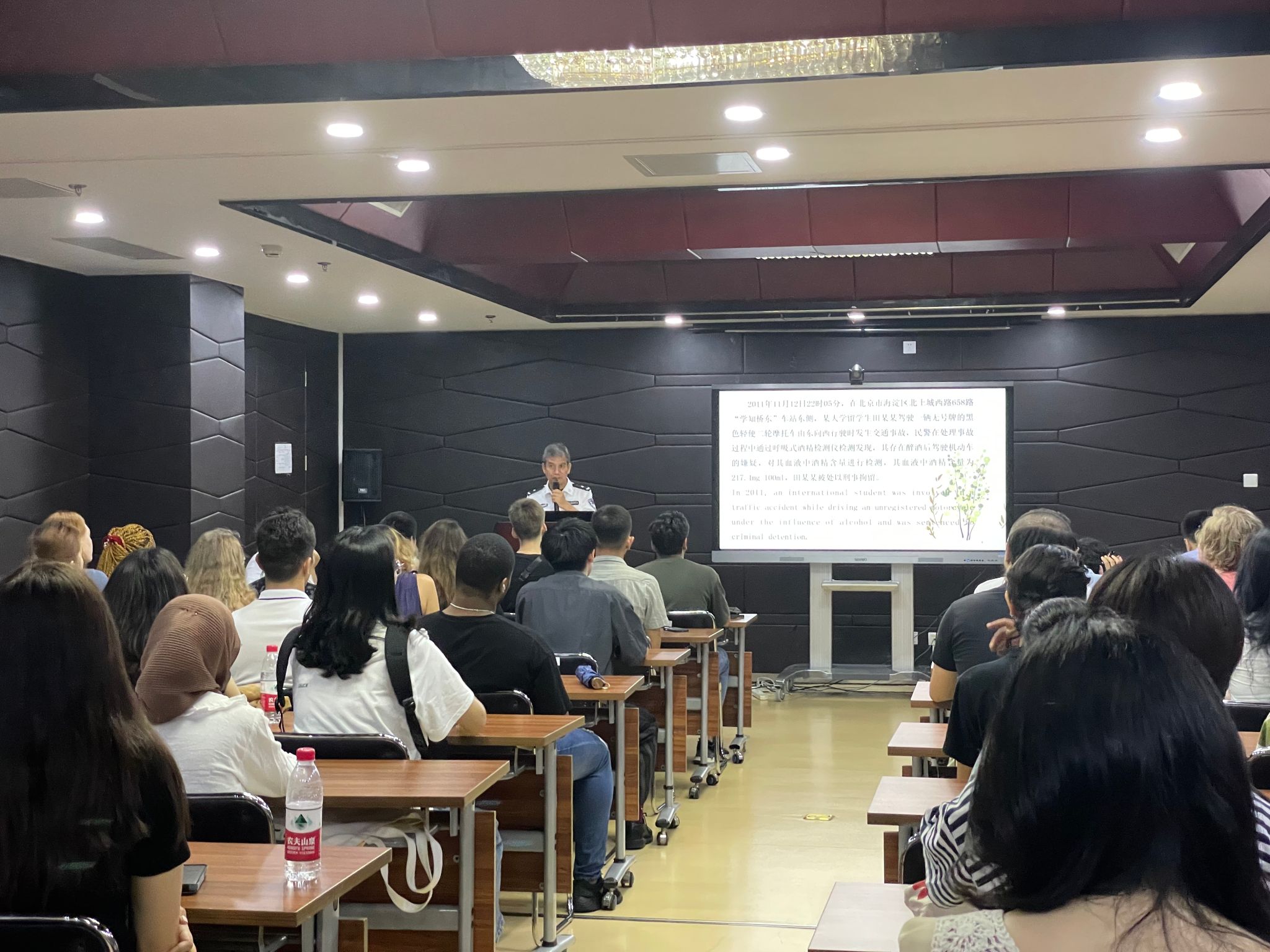 北京市海淀区高等院校交通安全工作部门联席会办公室警官李希宝做了交通安全教育,希望同学们能够很好地遵守中国的法律,避免人身伤害的发生,让远在家乡的家人放心,预祝同学们在北京的学习生活愉快、顺利、圆满!