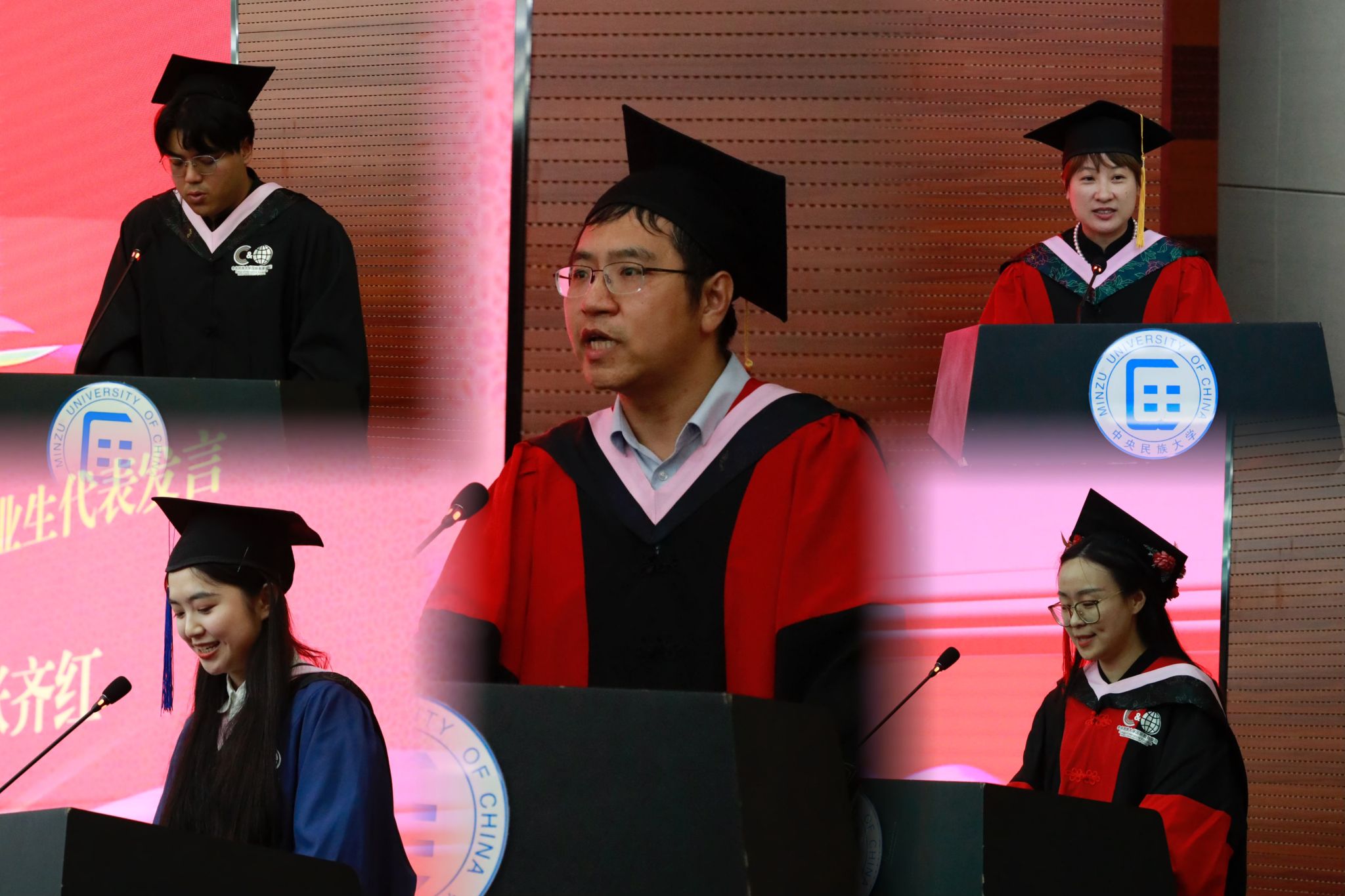 教师代表谷陵用“为天地立心,为生民立命,为往圣继绝学,为万世开太平”鞭策即将远行的学子坚定理想,拒绝躺平。用“大鹏一日同风起,扶摇直上九万里”勉励学子们胸怀天下,勇担时代使命,将东方智慧融入自身,为世界消弭误解、带去和平。她希望即将走上讲台的毕业生,热爱学习,热爱生命,始终保持对新领域、新事物的求知欲和探索心,心怀敬畏,求诸于己,勇于探索,只争朝夕。