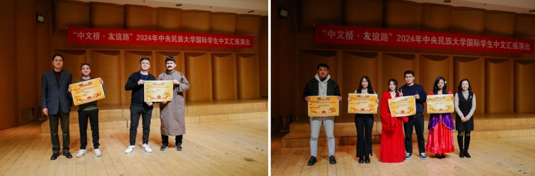 经过三位评委老师的现场评分,语言班3班和语言班5班分别荣获初中级组和高级组的特等奖,其他几个班级分别获得“最佳语言表达奖”“最佳艺术表现奖”“最佳内容创意奖”。周铁海书记和江傲霜副院长为获奖班级学生代表颁奖。