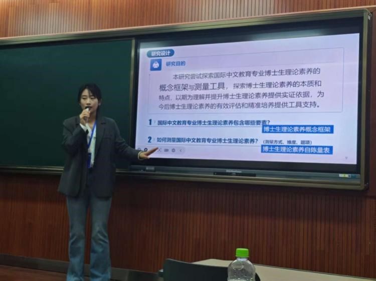 2024级博士研究生覃可作了题为《国际中文教育专业博士生理论素养量表编制研究》的报告。该研究从人文社科类博士研究生培养的现实问题出发,探讨了博士生理论素养的定义和测量维度。