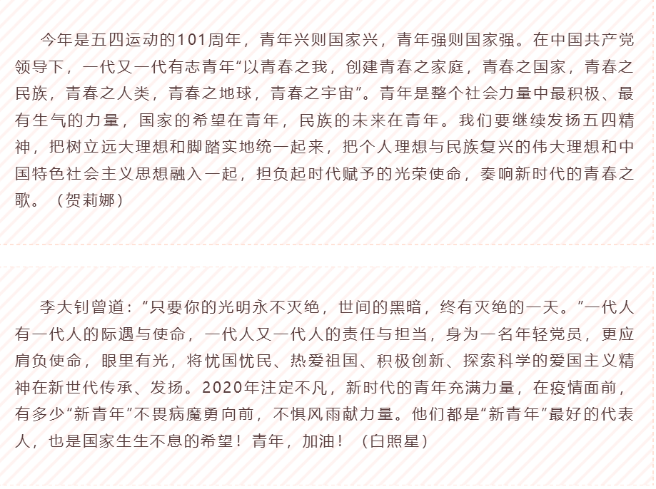 人们历来把青春视为花朵般美丽,青年代表着热血、激情、理想、信念、奋发向上的精神和无穷创造力。我们作为新代的青年使者,新时代的建设就是我们成长的基石与前进的力量。我们不会再回到五四运动发生的年代,现在这个时代是五四精神被赋予新内涵的时代。