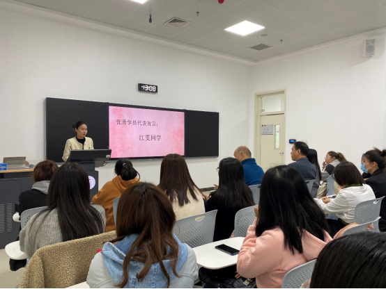 接着,本次培训班研究生学员代表江雯进行发言。江雯同学说到:“2021年是中国共产党成立的百年纪念,正因如此本次入党积极分子的培训显得意义深远。通过学院开展的一系列相关活动,我们可以从党的百年伟大奋斗历程中汲取继续前进的智慧与力量,团结带领有入党意愿的同学们了解党的光辉历史,感悟党的初心使命,领会党的创新理论,体认党的精神谱系,传承党的红色基因。”