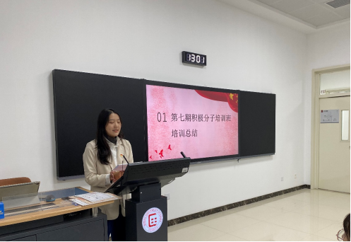 首先,2021级研究生党支部书记王梦月对入党积极分子线上党课学习和线下小组讨论的学习情况进行了总结,并对学员撰写主题实践报告、心得体会的情况进行了汇报。同时,她提出对入党积极分子未来的要求和期望,希望同学们以此次入党积极分子培训班为起点,在生活中、学业上、思想上不放松自己,坚定理想信念,紧跟党的步伐,严格地以一名优秀共产党员的标准要求自己,肩负起青年人的责任和担当。