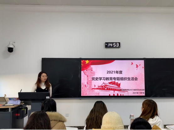2021级研究生党支部在明德楼116教室召开党史学习教育专题组织生活会,共有21名学生党员通过线上、线下方式参加会议。会议由2021级研究生党支部宣传委员徐心童主持。