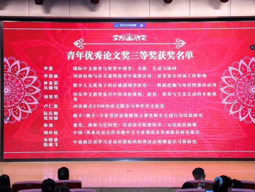 分论坛上,2022级博士研究生郝佳昕报告了《“中文+职业技能”教材发展历程、建设现状和应用实效》;2022级博士研究生吴双报告了《少儿中文数字教学资源四元分类参考框架构建》;2023级博士研究生陈艺宣报告了《基于微博语料的网络新词使用情感倾向研究》;2024级博士研究生刘艺珍报告了《汉语二语学习者元语言意识对阅读理解的影响:阅读障碍者与非阅读障碍者的对比研究》;2024级博士研究生郑懋森报告了《人智协同视阈下国际中文教育中的智能类型与协同关系》;2024级博士研究生刘雅珺报告了《数智化时代下国际中文教育主题教学法的实践路径研究》;2024级博士研究生哈丽哈什·穆舍塔尔报告了《大变局下哈萨克斯坦中文教育的机遇与挑战》。