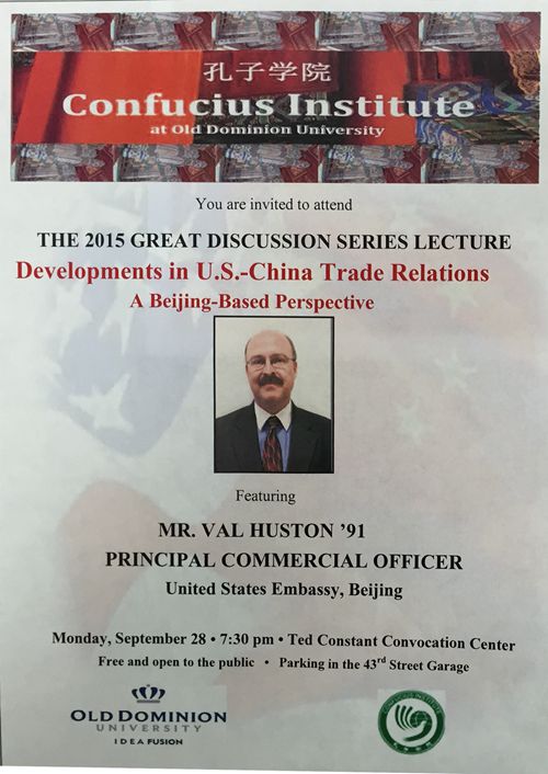 正值孔子学院纪念日和欧道明大学(Old Dominion University简称ODU)85周年校庆,9月28号晚上7:30,ODU泰德报告厅座无虚席,美国现任驻华使馆首席商务参赞Val Huston先生专程从北京回到ODU,作客欧道明大学孔子学院每年一度的高端论坛,做了一场题为《从北京看中美贸易关系的发展》的演讲。来自ODU各个学院的学生与Huston先生一起分享他的人生故事,听他谈中美两国的贸易关系。
