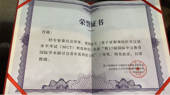 博士研究生肖媛的“基于证据观的医学汉语水平考试(MCT)效度研究”获青年优秀论文奖三等奖、银魂漫画