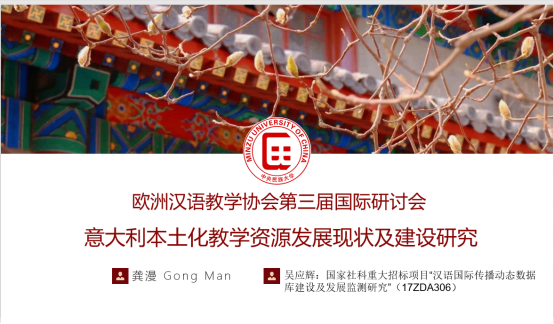 博士研究生龚漫做了分会场2的主题报告《意大利本土中文教学资源发展现状、影响因素和建设研究》,通过梳理意大利本土中文教学资源发展现状和使用情况,自建数据库,分析影响当地本土化中文教学资源的影响因素,最后提出可行性建议。报告结束后针对汇报内容现场进行了交流讨论,进一步深入了认识,碰撞了思想的火花。