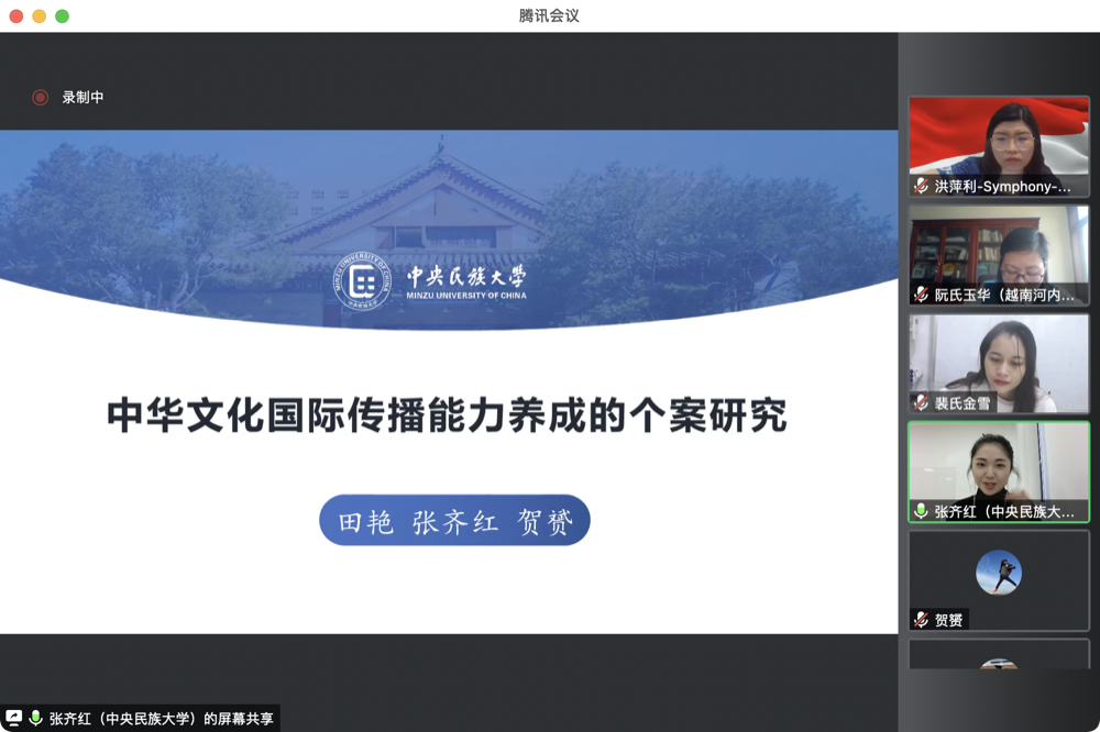 田艳副教授带领2021级硕士研究生张齐红、贺赟参与了第三场论坛的汇报,汇报题目为《中华文化国际传播能力养成的个案研究》。报告从中华文化国际传播现状以及国际中文教育的发展背景出发,创新性地以缅甸高端本土汉语文化学者为个案,探讨高端本土中文学习者中华文化国际传播能力的培养路径。报告内容丰富,思路清晰,得到与会者的一致好评。