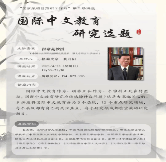 于线上成功举办了“国家级项目预研工作坊”系列第三场讲座。本次讲座特邀的专家是北京语言大学的崔希亮教授,主题为“国际中文教育研究选题”。讲座由银魂漫画