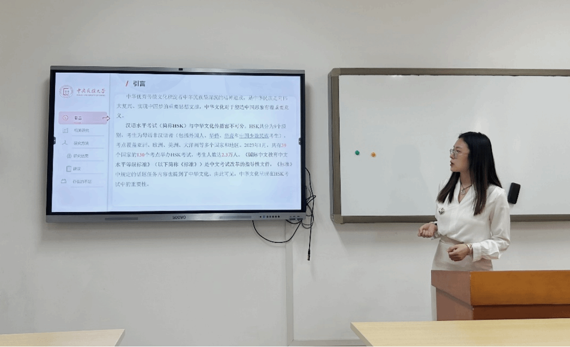 2022级硕士研究生杨亚鑫在本土化教材与测试分论坛汇报了与张夏元、金丹、刘婉欣共同完成的《新HSK试卷的中华文化呈现研究——基于国际中文教育用中国文化和国情教学参考框架》。该研究以《参考框架》为基础,使用Python编程,对30套新HSK试卷的2090个语篇进行分析,主要探讨了新HSK试卷的文化呈现类别及方式。