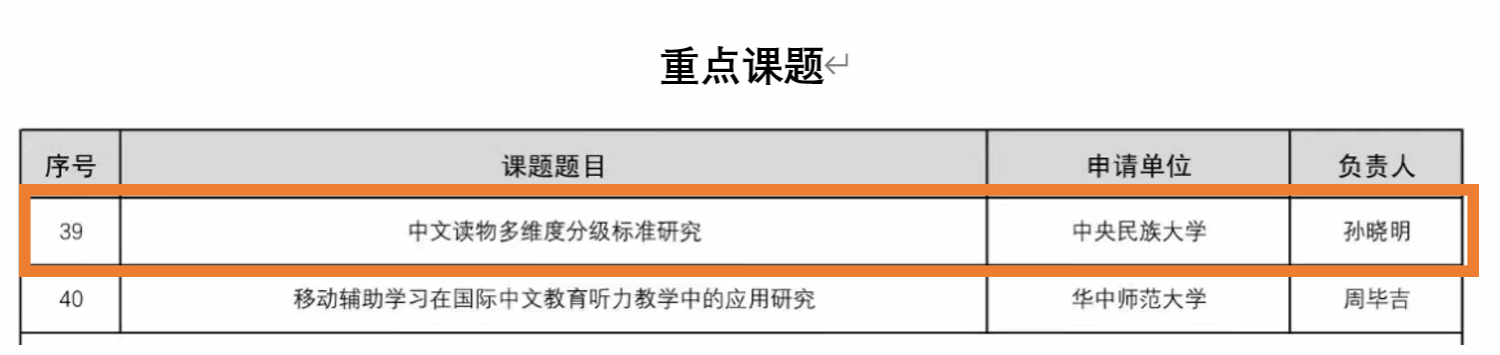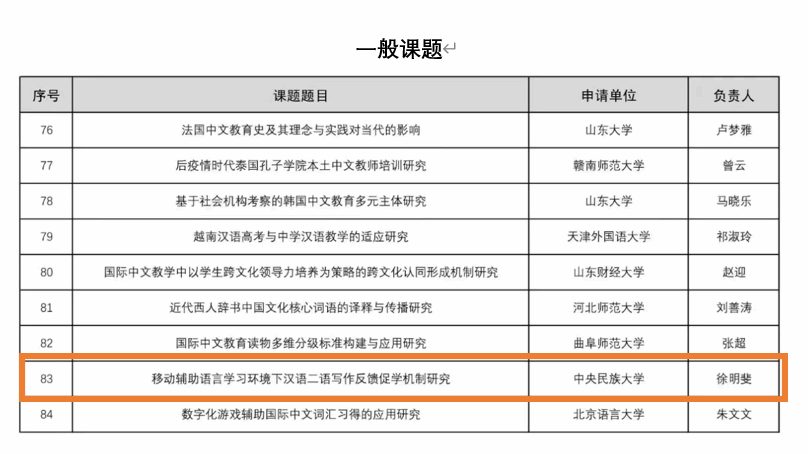 孙晓明老师的“中文读物多维度分级标准研究”获重点课题立项;徐明斐老师的“移动辅助语言学习环境下汉语二语写作反馈促学机制研究”获一般课题立项;胡琬莹老师的“国际中文教育志愿者超语态度发展研究”获青年课题立项。