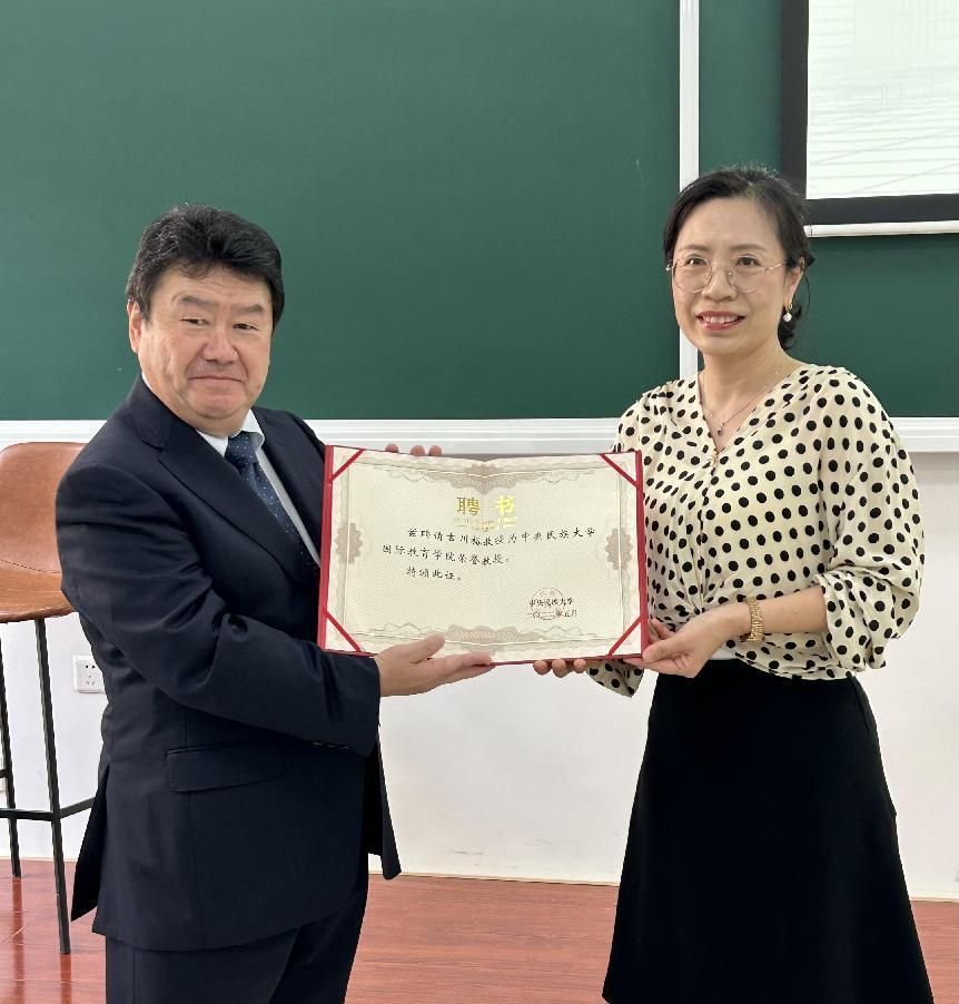 荣誉教授”的证书。证书颁发仪式结束后,古川裕教授做了题为“从教学语法角度谈汉语补语的特点”的学术讲座。