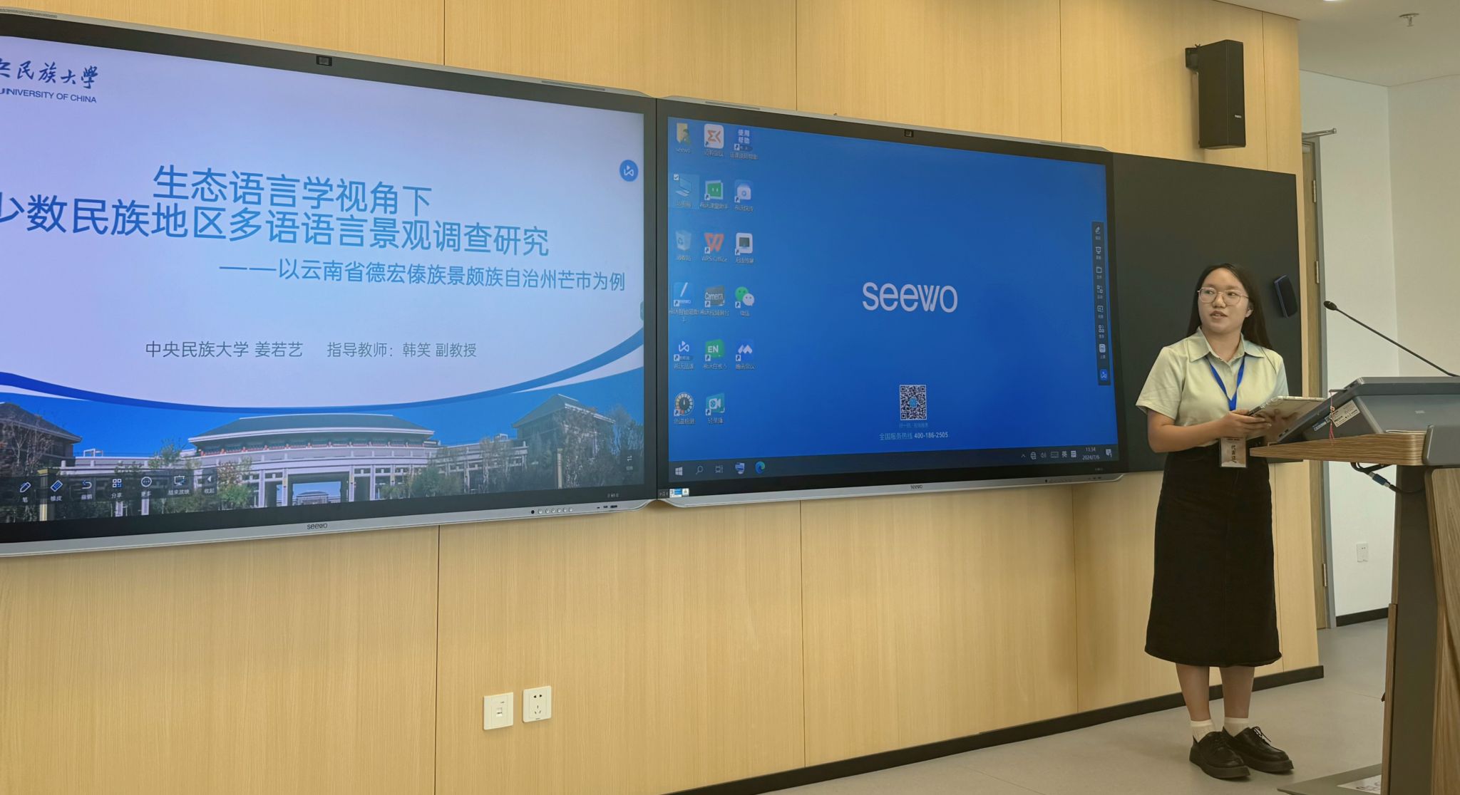 2021级本科生姜若艺报告了在韩笑老师指导下完成的《生态语言学视角下少数民族地区多语语言景观调查研究——以云南省德宏傣族景颇族自治州芒市为例》。该研究在生态语言学视角下,以云南省芒市多语语言景观为材料,探索少数民族地区语言景观及语言生态现状,为少数民族地区多语语言生态优化提出了建议。