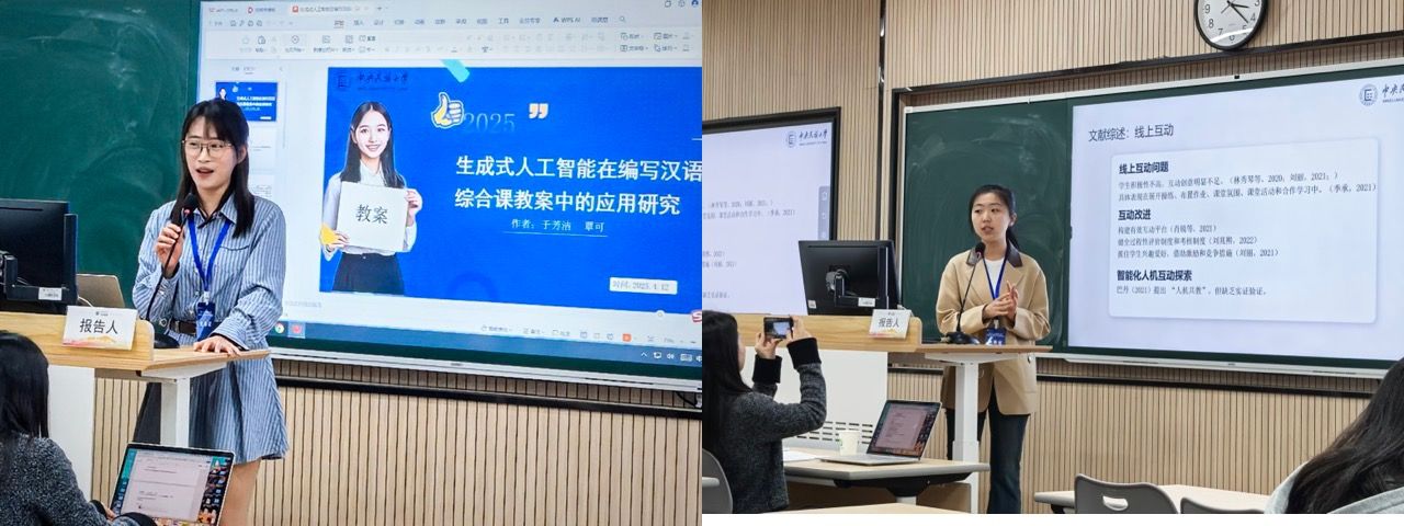 2023级硕士研究生于芳洁与2024级博士研究生覃可合作汇报了《生成式人工智能在汉语综合课教案设计中的实证研究》。该研究首先构建了初级综合课教案评价清单,发现AI生成教案在一线教师评分中表现更为优异。2022级本科生薛琛婧报告了《生成式人工智能+国际中文线上录播课程的交互行为研究》。该研究针对线上录播课程交互性不足的问题,通过实验检验了其对线上录播课交互性的提升效果。